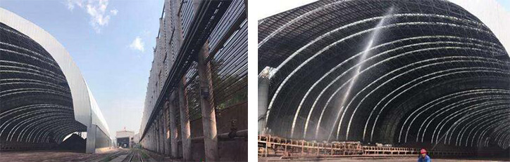“环保大棚”设有固定的自动喷淋装置,可有效抑制粉尘。